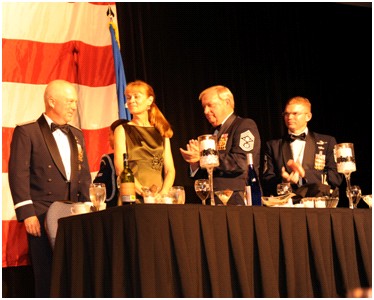 Airmen donned full service or mess dress uniform and cheered General Wurster and his wife Ronda as they arrived at the conference center. As the Wursters' entered the main ballroom, the hall reverberated from the bagpipes playing, thunderous applause and the crowd banging 105mm and 40mm shells together to celebrate a general they hailed as "an Airman among Airmen."