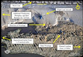 e. Impact The MA impacted the ground at 1805L in Cley Marshes, 2.4 miles west of the LZ (Tabs J-6 and S-16). At the time of impact, the MA had banked left in excess of 90 degrees, where it had no vertical lift and could not maintain altitude (Tab J-6 and V-17.18). The MA hit the ground approximately three seconds after the initial bird strikes (Tab EE-6). The main wreckage dispersed from west to east over approximately 180 feet in the direction of the LZ and along the route of flight (Tab J-8). The crash was not survivable (Tab J-17).