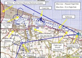CLICK ON PHOTO TO ENLARGE Figure 2: Flight Path of the Flight Lead Aircraft (Tab S-16). HH-60G, TAIL NUMBER 88-26109, 7 JANUARY 2014 7 The FLA and MA arrived at the planned IP, located approximately one mile south of Blakeney, 25 minutes into flight. The MF executed a left orbit and began verifying the status of the simulated downed pilot in accordance with HH-60G procedures (Tabs R-5, S-15, and BB-132). At the IP, winds came from 210 degrees at 20 knots and gusted to 31 knots (Tab F-7). The wind pushed the MF north toward Blakeney (Tabs R-5 and S-16). To comply with noise abatement procedures and address safety concerns, FLP ordered the MF to move the orbit 1.3 miles north and establish a new IP closer to the coastline (Tabs R-5, S-16, V-3.14, and V-4.12). The new IP stayed clear of the nearby Blakeney Reserve—a known no-fly area—and any known moderate or severe bird hazard areas (Tabs R-5, S-15, V-3.40, NN-3, and NN-5).
