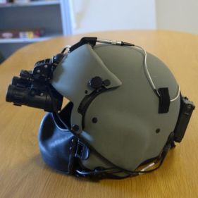 All members of the MC wore battery-powered ANVIS-4949 NVGs mounted to their helmets to amplify ambient light and provide visual illumination for the flight (Tabs R-13, R-55, R-131, R-140 to R-141, V-3.22, and BB-292). The NVG field of view is more limited than the human eye’s field of view, and causes a loss of peripheral vision. This loss of peripheral vision limits the ability of the person wearing NVGs to sense motion and attitude cues (Tab HH-4 to HH-5). As shown in Figure 4 below, the NVGs are attached to the helmet and sit immediately in front of the eyes (BB-292). Figure 4: ANVIS-4949 Night Vision Goggles Mounted to HGU-56/P Helmet (Front and Side Views) (BB-292). All four of the MC’s NVGs were destroyed in the mishap (Tabs R-131, R-140 to R-141, V-1.17, V-1.21, V-4.15, V-4.18, and V-5.10).