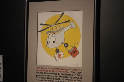| This Walt Disney Productions drawing of "Pedro" was commissioned by Detachment 7, 38th Aerospace Rescue and Recovery Squadron (ARRS), Da Nang Air Base, South Vietnam in 1966. The insignia design was inspired by the unit's radio call sign of "Pedro". Planned as the unit insignia for all H-43 helicopter units in Southeast Asia, the pace of the war prevented it from being implemented. This drawing, however, meant a great deal to those who flew PEDROs at Da Nang, and elsewhere |