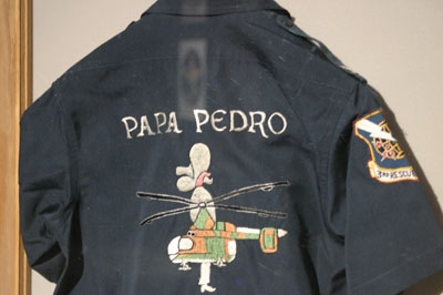 This party suit belonged to Col. Don Jensen, who was the 38th ARRS commander from Feb 1970-Feb 1971. Illustrating how the design became part of the unit culture, the embroidered design shows "Papa Pedro," a variation on the PEDRO theme utilized by the 38th ARRS.