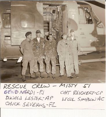 Front Lt-Rt: The HH-3E crew from the 37th ARRS was, from left: Pilot: Capt. Jon Hannan, Copilot: Maj. Robert Shular, PJ: Eugene Nardi, FE: Charles Severns. (Names provided by Wayne Mutza)