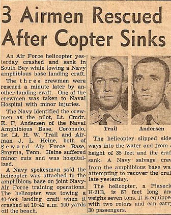 The first day of testing we went to the strand south of Coronado, CA. They had a D-8 CAT on the beach. We were able to tow it with no trouble. So they lowered the blade into the sand, and we were still able to tow it with no problems. I flew that day on A1C Heine’s aircraft. He was on the beach with Navy personnel observing the operation.