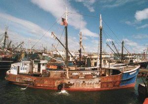 After about 20 to 30 minutes we spotted the boat bobbing up and down in rather high waves flying the inverted flag. The patient was already on the lorry stand on the stern ready for pick-up. As we maneuvered over the boat the mast was a huge obstacle and eventually wound up between the sponson and fuselage. I was calling out directions the best I could with changing conditions. I had a handful of hoist cable as well as the *"joy stick" which was all but useless in the high winds so I let Capt. Winden take control of the aircraft.