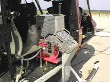 UH-1N 69-6617, "The Machine" A specially adapted fire starting machine attached to the Huey used to ignite controlled fires in front of wild fires to suppress wood/forest fuel for fast moving wild fires. The machine is pictured with 4-bags of ping pong balls which are loaded into the device and injected inside the machine with the glycerol combination and fired at a rate of 4-balls at a time. Once on the ground they begin to ignite and start the controlled burn. The weight of the glycerol compound was enough to ensure the ping pong balls fell straight down, but having them fly back into the cabin from rotor wash was always a concern. (1997)