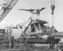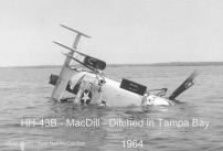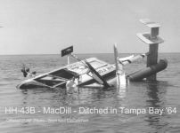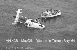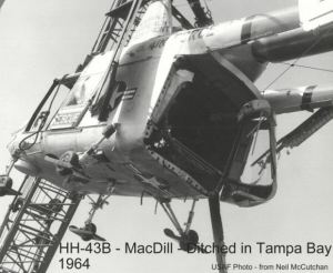 CLICK ON PHOTO TO ENLARGE Pilot Capt. David Frasier and I (Neil McCutchan) were hovering over a deep water channel off MacDill giving those in the back basket pickup experience. While hovering we heard a sound similar to rapid gun fire. David said we were losing power. As co-pilot I issued the call that we were ditching in the bay. As this was being done David was able to get the helicopter over shallower water (6 feet vs. 12 or more feet). The helicopter settled in the water with the co-pilot’s side of the bubble resting on the bottom. It was lucky that the plexiglass broke and I was just able to ‘walk’ through it on the bottom where I popped the ‘water wings.’ Yes, another ’43 came out to get us but we waved it off as a boat from the base recreational dock was coming out. After over 24hrs in the saltwater of Tampa Bay the helicopter was not salvageable. They had to wait to get a barge into position. Getting the barge and tides were problems. (NEIL McCUTCHAN)
