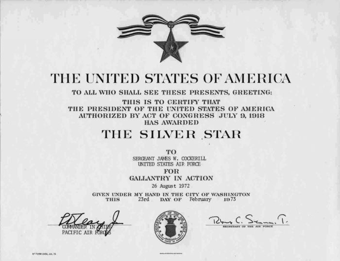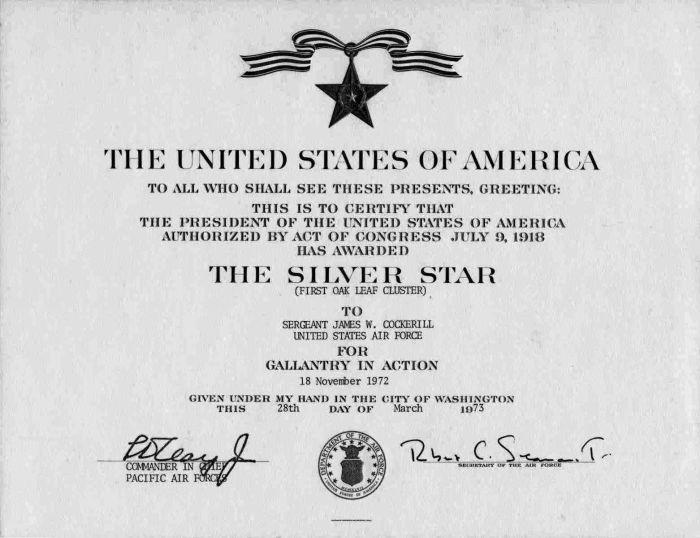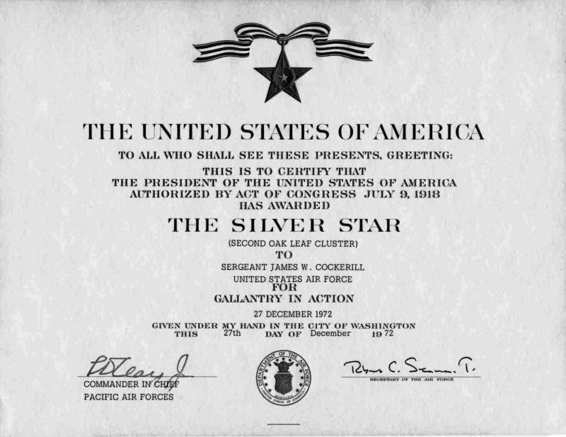The President of the United States of America, authorized by Act of Congress, July 8, 1918 (amended by act of July 25, 1963), takes pleasure in presenting a Second Bronze Oak Leaf Cluster in lieu of a Third Award of the Silver Star to Sergeant James W. Cockerill, United States Air Force, for conspicuous gallantry and intrepidity in action while serving with the 601st Photo Squadron, Detachment 12, 40th Aerospace Rescue and Recovery Squadron, Nakhon Phanom Royal Thai Air Base, Thailand, 7th Air Force. Sergeant Cockerill distinguished himself by gallantry in connection with military operations against an opposing armed force near Hanoi, North Vietnam, on 27 December 1972. On that date, Sergeant Cockerill, an Aerial Combat Photographer on an HH-53C Rescue Helicopter, voluntarily flew into a highly hostile area to attempt the rescue of a downed American airman. With his helicopter receiving intense ground fire, Sergeant Cockerill stood in the unprotected crew door to aid in searching for the survivor; and then, when the survivor was located, he openly stood beside the hoist operator and fired a machine gun to provide protection as the rescue device was lowered. By his gallantry and devotion to duty, Sergeant Cockerill has reflected great credit upon himself and the United States Air Force.