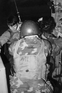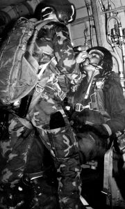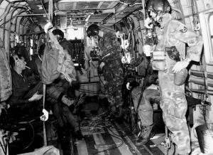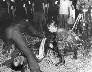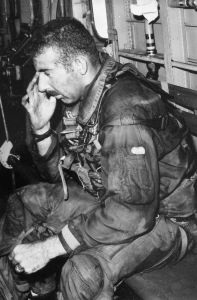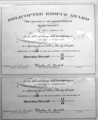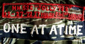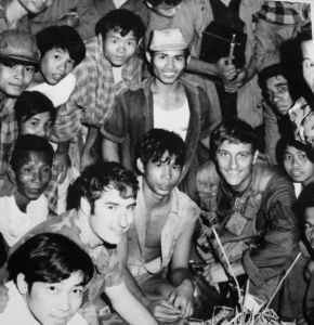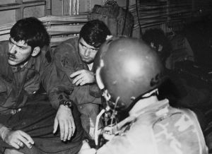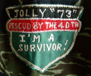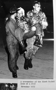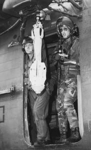 The rescue of a B-52D, (tail #56-0599) Crew Member (center) that Crashed near NKP on 27/28 December 1972, by HH-43 Pedro. Combat Photographer Rocky Revieto (on left) & NKP Flight Surgeon (on right). |