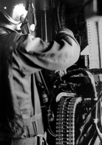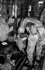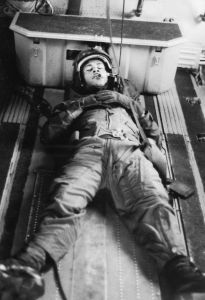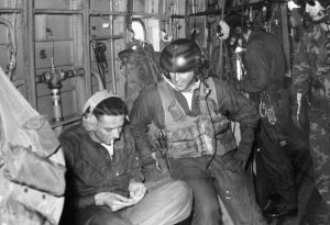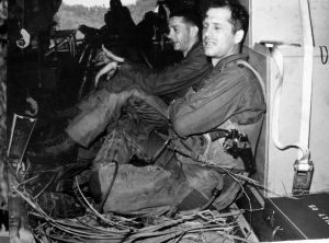 (wearing parachute) treating Lt. Borders (on right stretcher), (on left stretcher) is TSgt. Don Looper (wounded crew