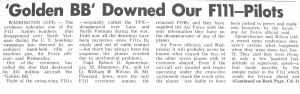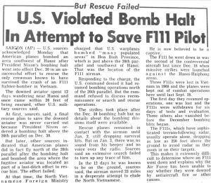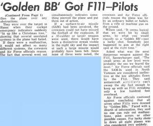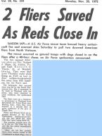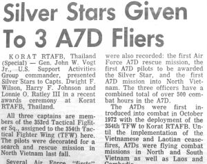Newspaper story about the award of the Silver Star Medal to A-7D pilot's Capt.'s Dwight F. Wilson, Harry F. Johnson & Lonnie O. Ratley III for the first A-7D "Sandy" rescue mission. |