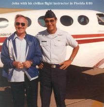 I knew my brother pretty well, probably as much as anyone outside his immediate family. He would not want you to spend lots of time grieving for him, even though many of us will miss him very much. Rather, celebrate his zest of life. Try to learn from what he left us. I’ll close with the final stanza of the poem dedicated to my grandfather. I think he would agree that it would apply to his grandson. Oh yes my man we love you well And when on high, we’ll gladly tell The angels there the joy you gave And bless you too beyond the grave I think that my brother, to use his own words is, “out of the U.S. and over the Atlantic on track whiskey just east of Gander N.F.” and in heaven right now. He’s probably debriefing my Dad and the others on all that has happened in the last thirty years. My Dad is probably enjoying hearing about what John had achieved in his brief 49 years, the flying, the business success and especially his family. As one of his flying buddies said as we left the cemetery, “Happy Landings, old friend” Comment in email from David regarding John's funeral. The guard guys all showed up at his funeral; the commander, pilots, crew chiefs, PJ's. He was well liked and respected.