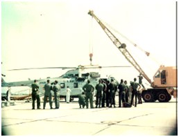 Crews were now un-boxing the main rotor blades and readied them on the blade sling to be installed. We now had another rented crane, so we moved the aircraft forward and installed the blades one ship at time and then moved them out on the flight line for final inspection and ground run-up checks (blades were tracked).